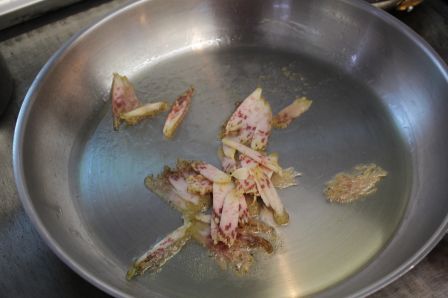 1. Commencez à froid : les vermicelles de ventrèche dans la poêle.