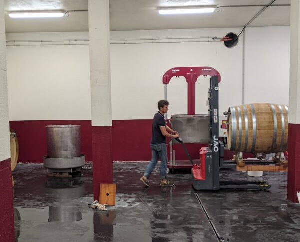 Avec des demi-muids (grosses barriques de 600 litres) spécialement équipés pour la vinification de nos micro vendanges.