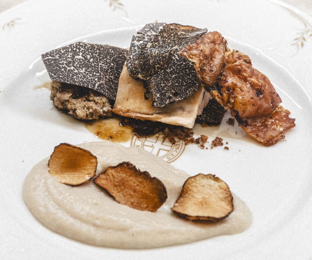 Suprรชme de poulet, peau croustillante, purรฉe et chips de topinambour, truffe
